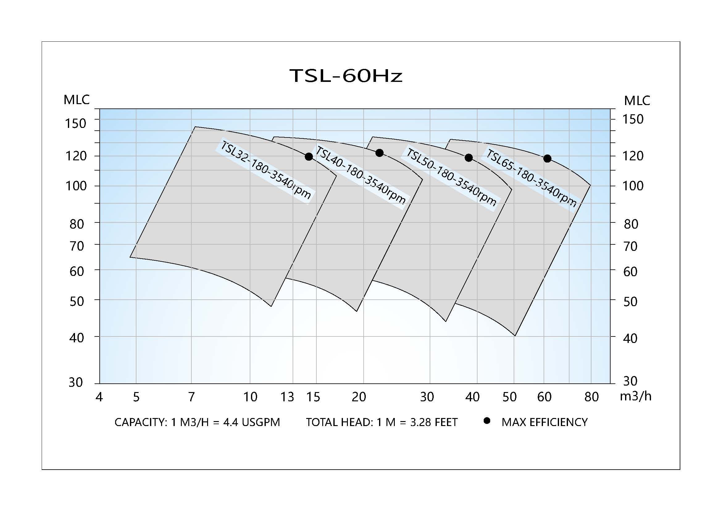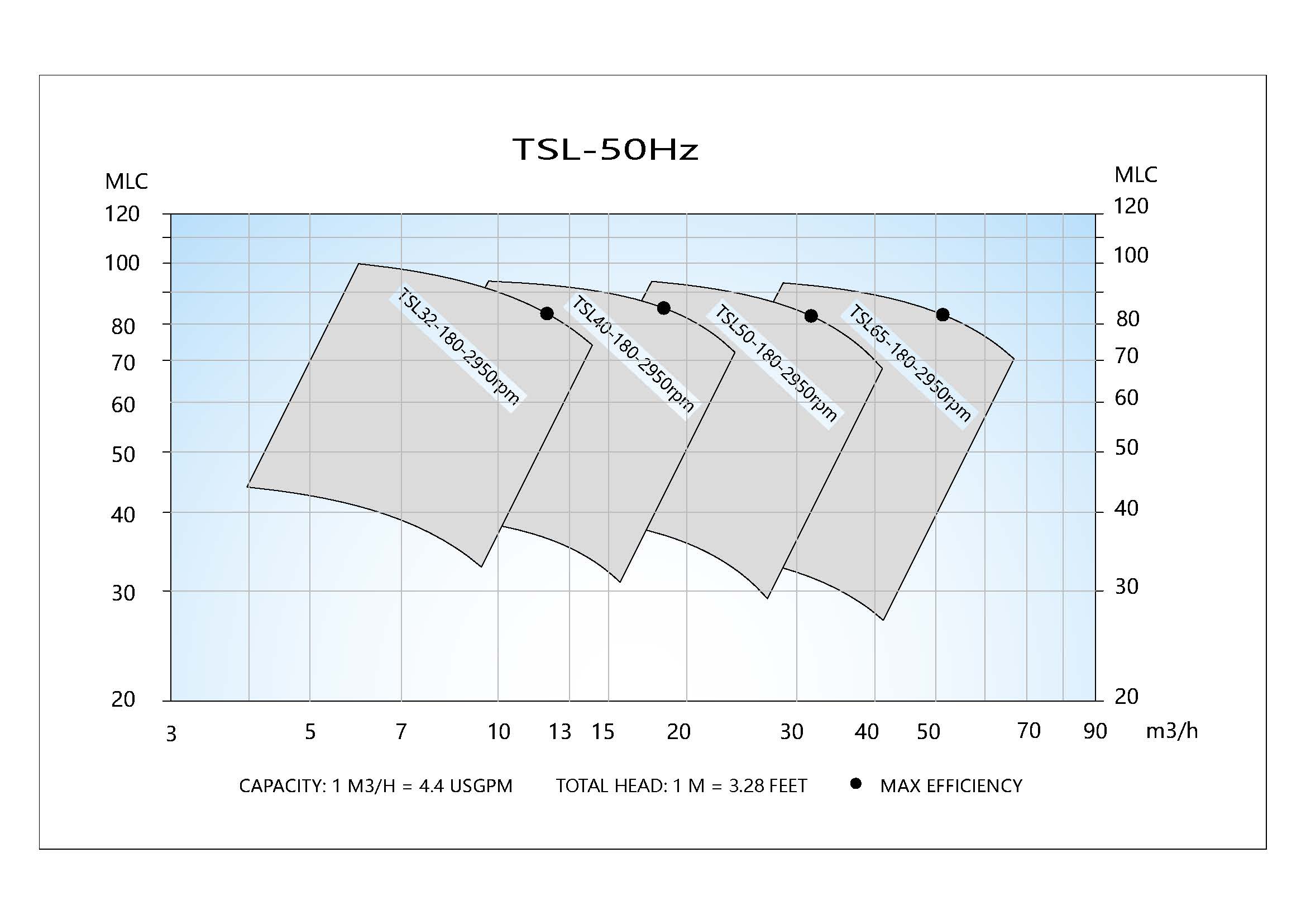 TSL-pumperne er to-trins, enkelt-sugende centrifugalpumper med højt differenstryk, med en kapacitet på op til 80 m³/h og et tryk på op til 135 mLC ved 60 Hz. Både vertikal og horisontal installation er mulig. Suge- og trykstudsen kan leveres i inline- eller vinkeludførelse.